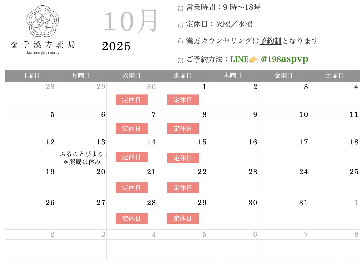 【10月定休日】火曜・水曜
