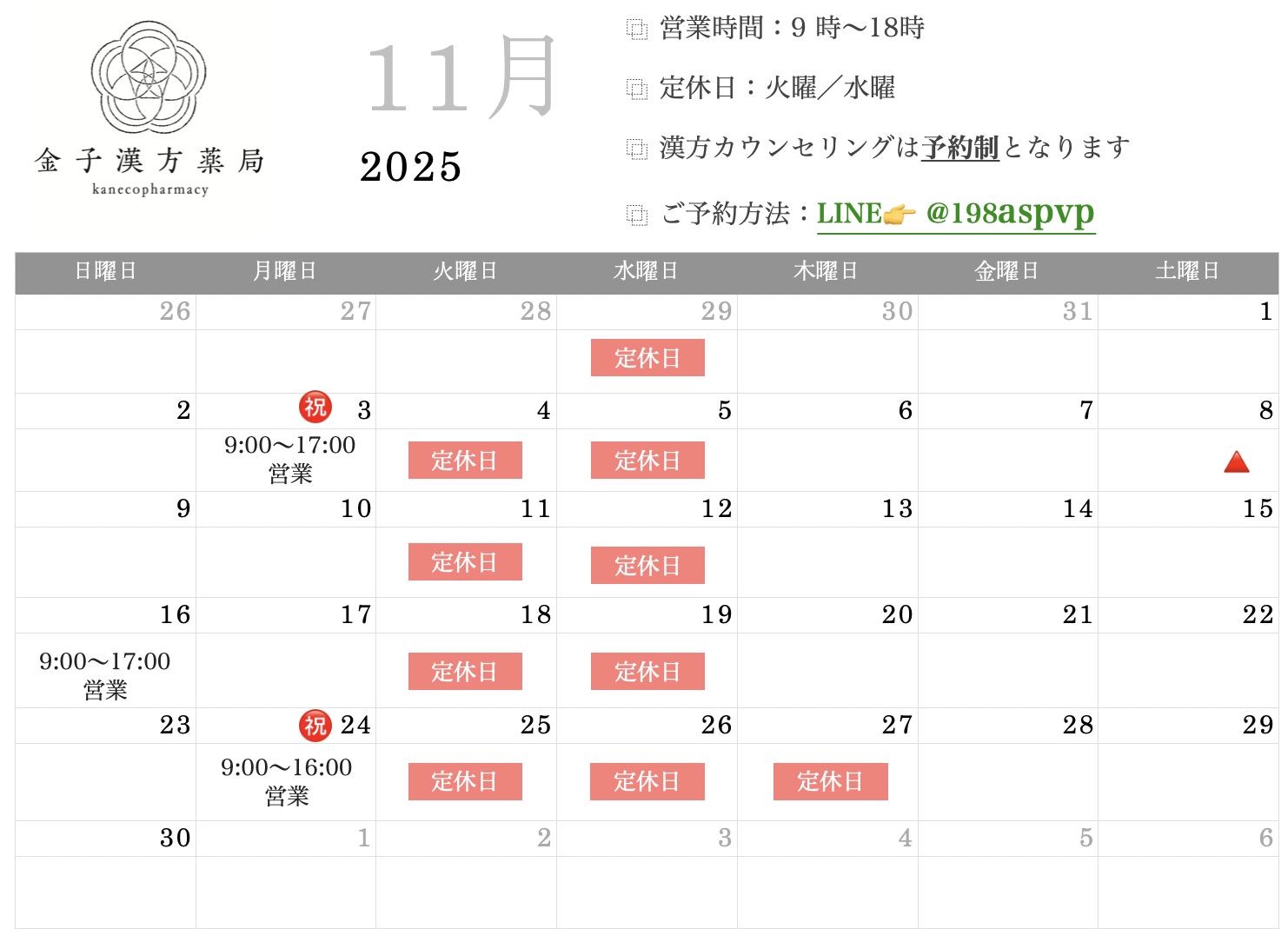 【11月定休日】火曜・水曜 + 11月27日(木)