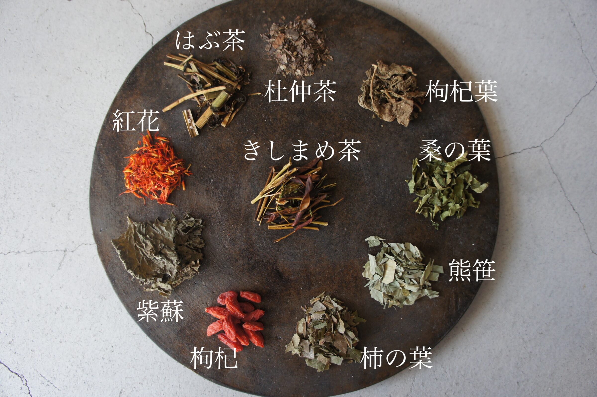 クコの葉・クコの実・柿の葉・杜仲茶・桑の葉・熊笹・紅花(サフラワー)・紫蘇をブレンド