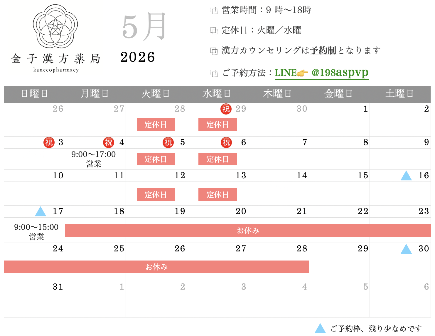 火曜・水曜 + 5月18日(月)〜28日(木)
